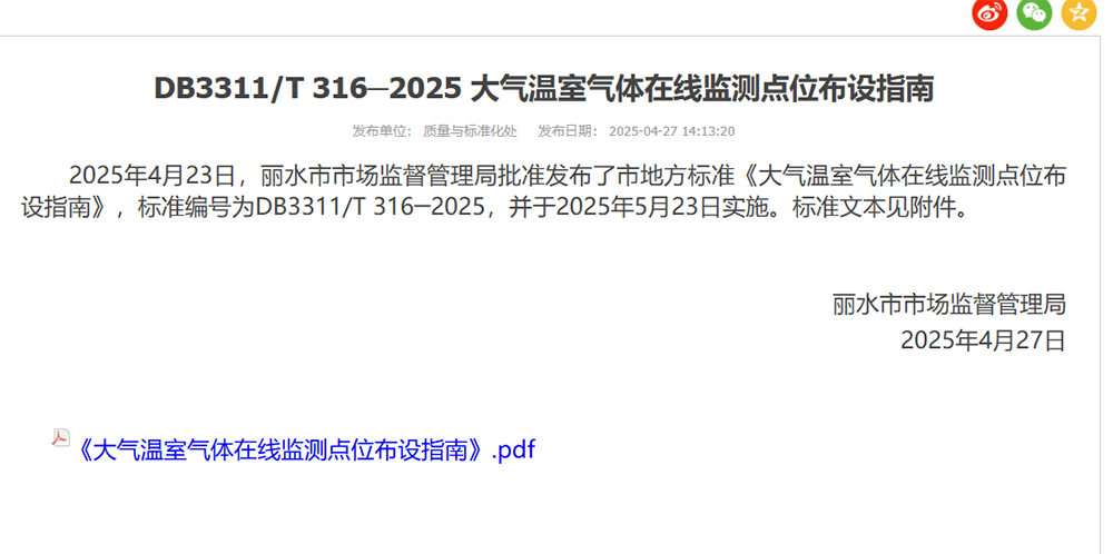 省環(huán)保集團(tuán)牽頭起草的麗水市地方標(biāo)準(zhǔn)《大氣溫室氣體在線監(jiān)測(cè)點(diǎn)位布設(shè)指南》正式實(shí)施