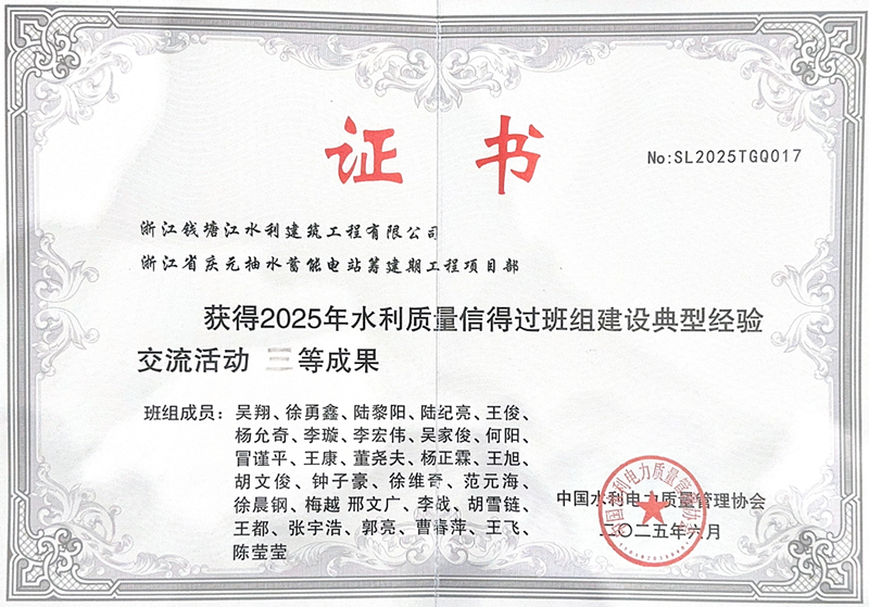 浙錢水建慶元抽蓄項(xiàng)目部榮獲全國水利質(zhì)量信得過班組獎(jiǎng)項(xiàng)